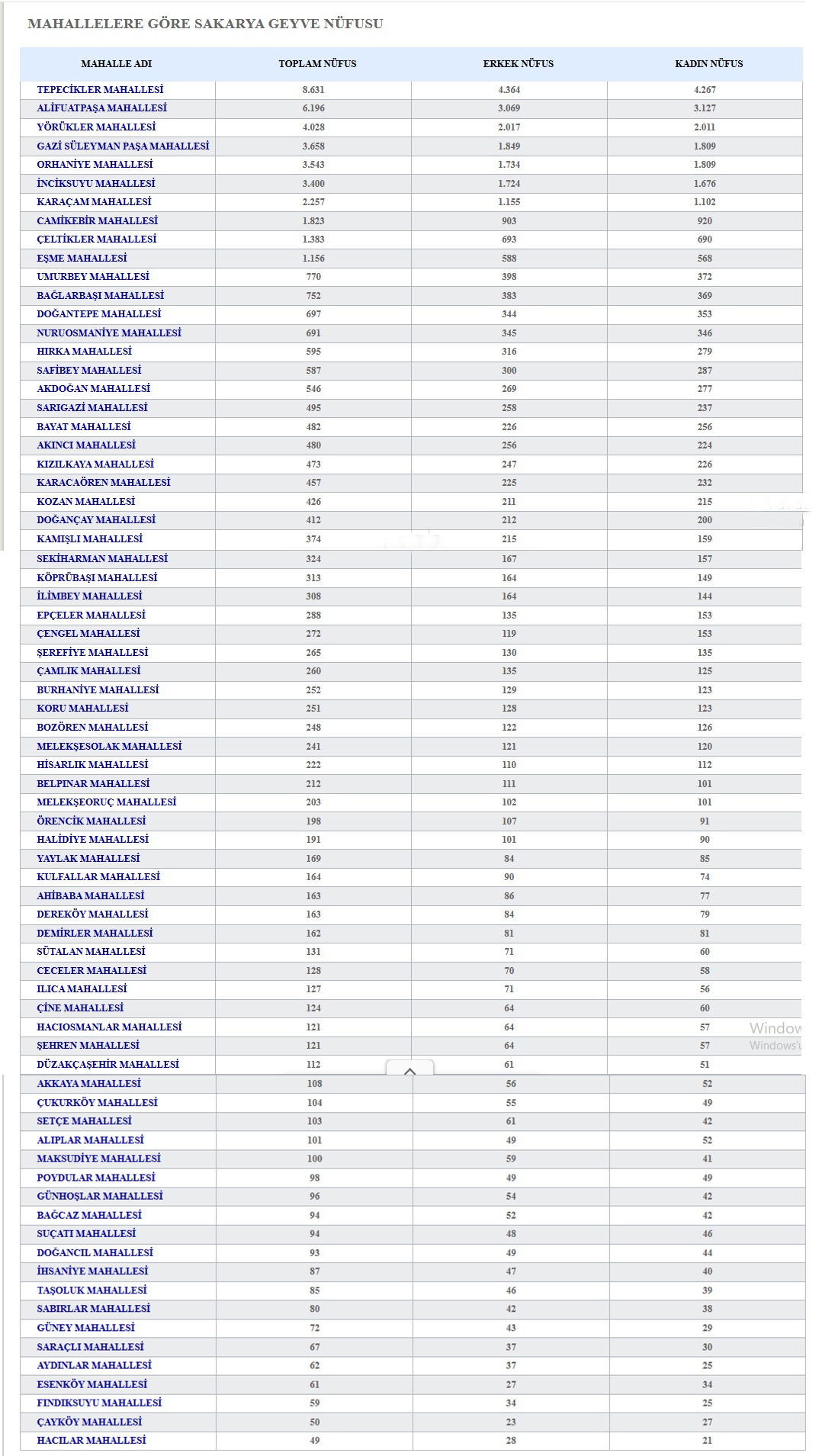SAKARYA GEYVE NÜFUSU DETAY